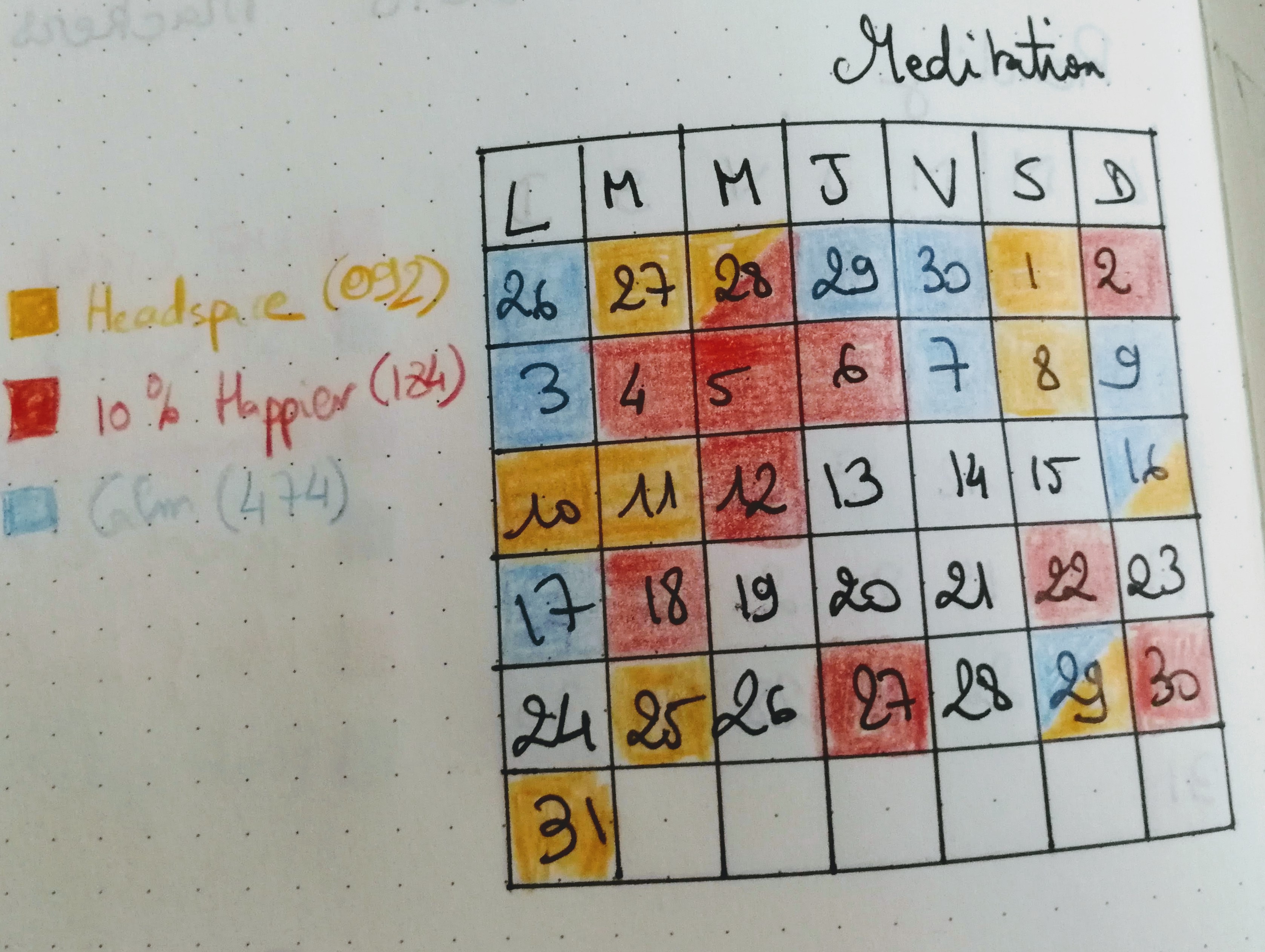 A bit. The general gist of it – sitting with a guided meditation – didn’t change much. But I’m now typically sitting cross-legged on the couch or the bed instead of sitting on a chair; and I changed my “guided meditation” habits a bit. I used to use only Headspace – I’ve been experimenting with other apps. That’s what the colors in the tracker above are: “what app did I use that day”. I gave a try to Calm: I don’t think it’s a fit for me right now, I find it too corny for my taste. I still like Headspace for the “straightforwardness” of it. I do like 10% Happier a lot because it’s more fun and there’s an instructor there (Jeff Warren) that I particularly like.
