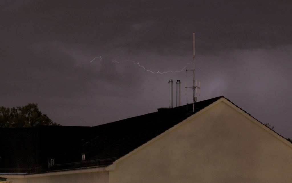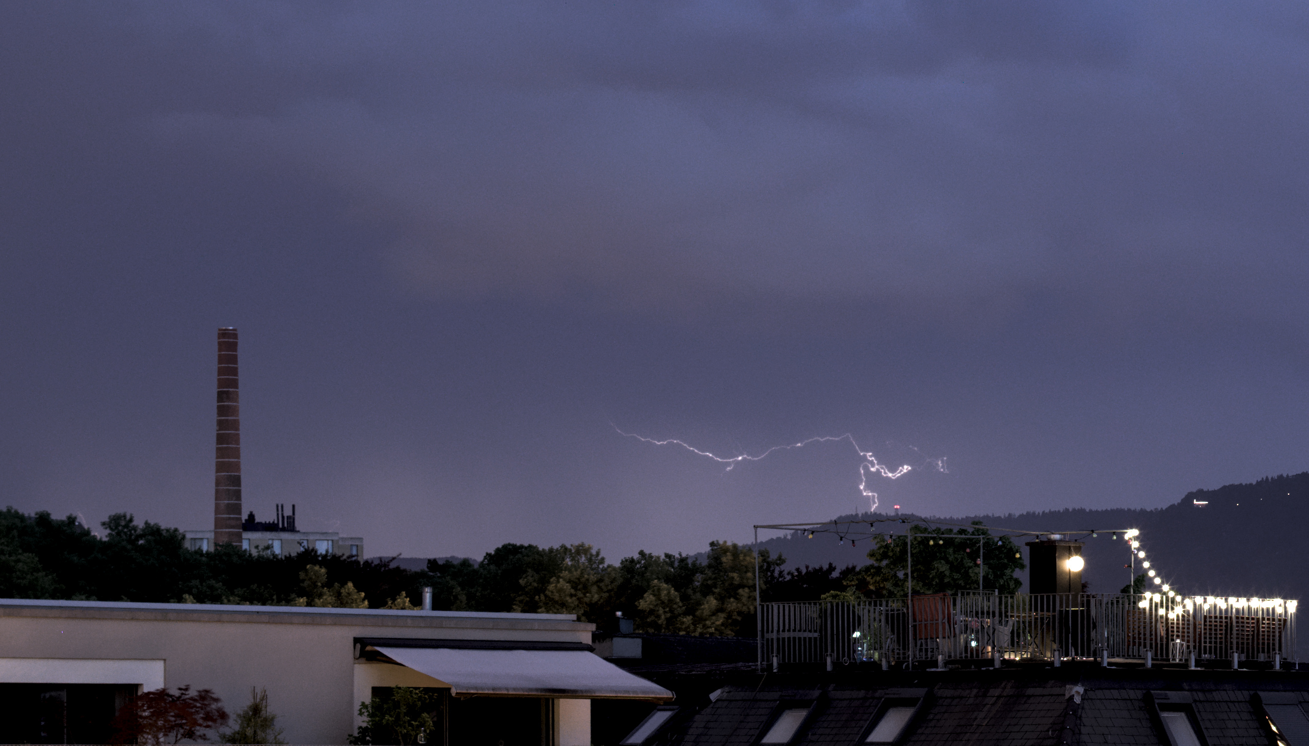 The day before yesterday there was a bit of distant thunderstorm – distant enough that there was no rain (and essentially no sound). So I got the camera out and I started playing around with it. I had never tried my hand at that, and the thunderstorm was fairly quiet (for a thunderstorm), which means I got a meager 4 reasonable pictures out of 106 exposures 😛