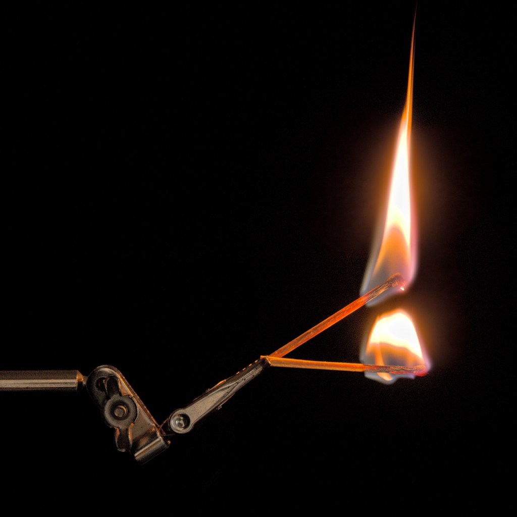 Third hand holding the matches, settled on a flimsy light tripod (but with a sturdy, flat tripod head), put on top of oven plates (there to catch ashes and whatever hot stuff may fall from the matches), water and fire blanket on hand, black background far enough that the probability that it accidentally catches fire is very low. And a lighter, because no way I’m going to actually strike the matches to light them in this setup 🙂