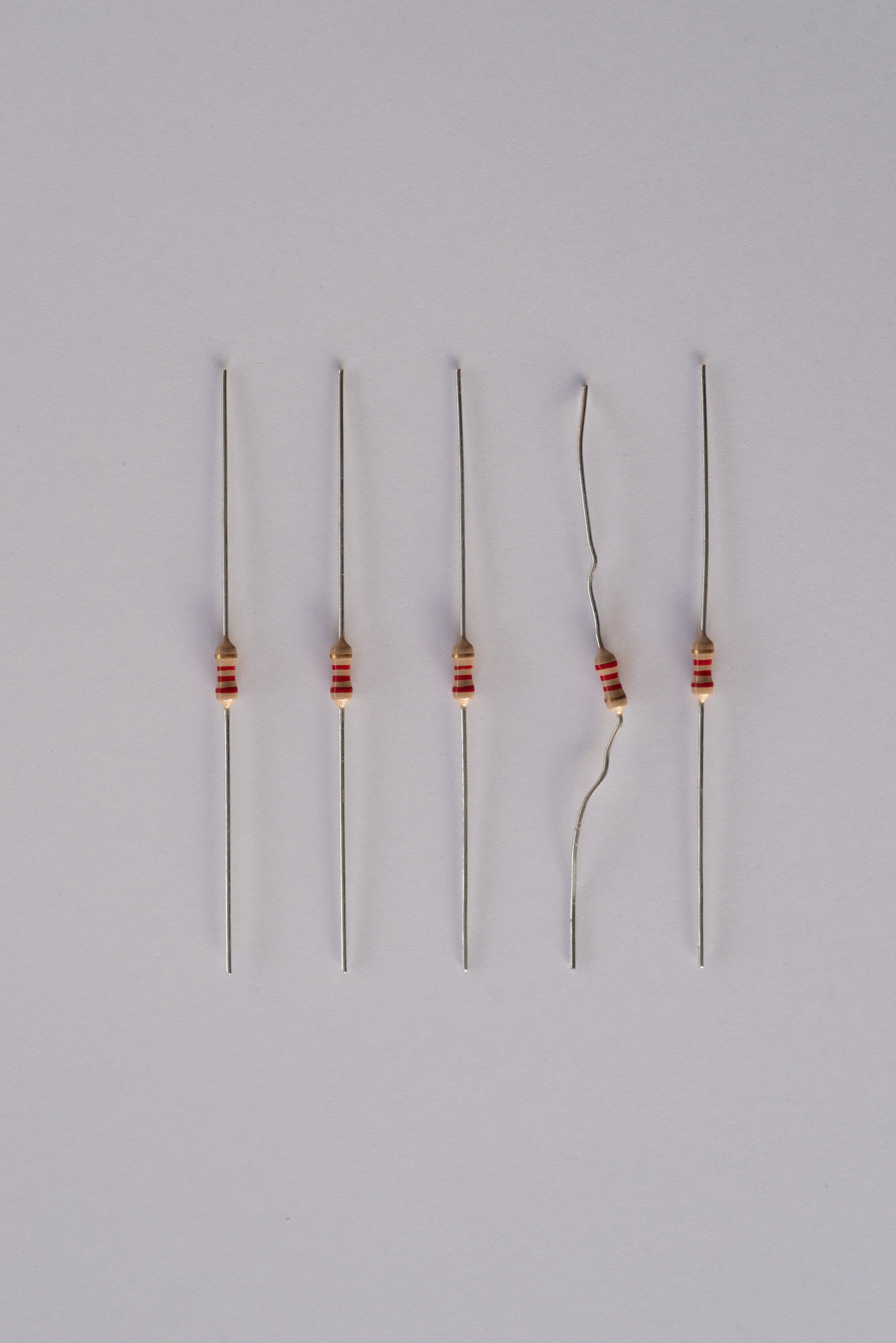 But this got me into my electronics boxes, where I found a bunch of brand new resistors cohabitating with the few that had been used already… and whose leads showed it. The setup was pretty minutious, to get a square picture where the resistors would be properly spaced on the whole picture; this is what I ended up with for the final shot.