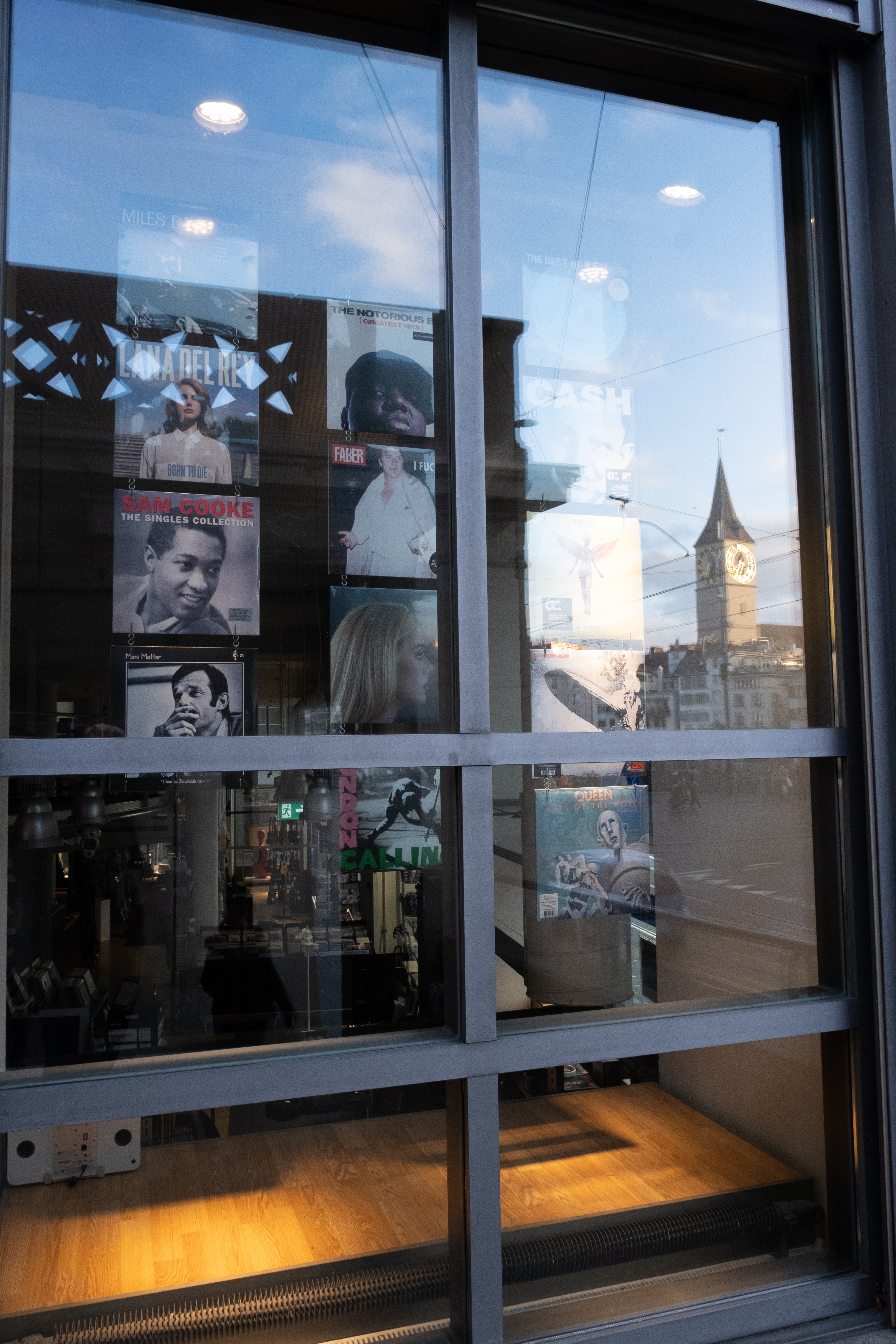 But I still turned around the building, and their collection of displayed vinyls caught my eye, mostly because it has one of my favorite albums on display! (Yes, that’s be the Queen one 😉 ). And when I realized that the St.-Peter church (and Europe’s largest church clock face!) was visible in the reflection… well, if you can’t beat’em join’em – it actually made me happy to get a better picture for my overarching “Zürich” theme than I would have gotten if I had gone with my first idea – it’s actually one of my favorite pictures for this round :). Here’s the initial picture: