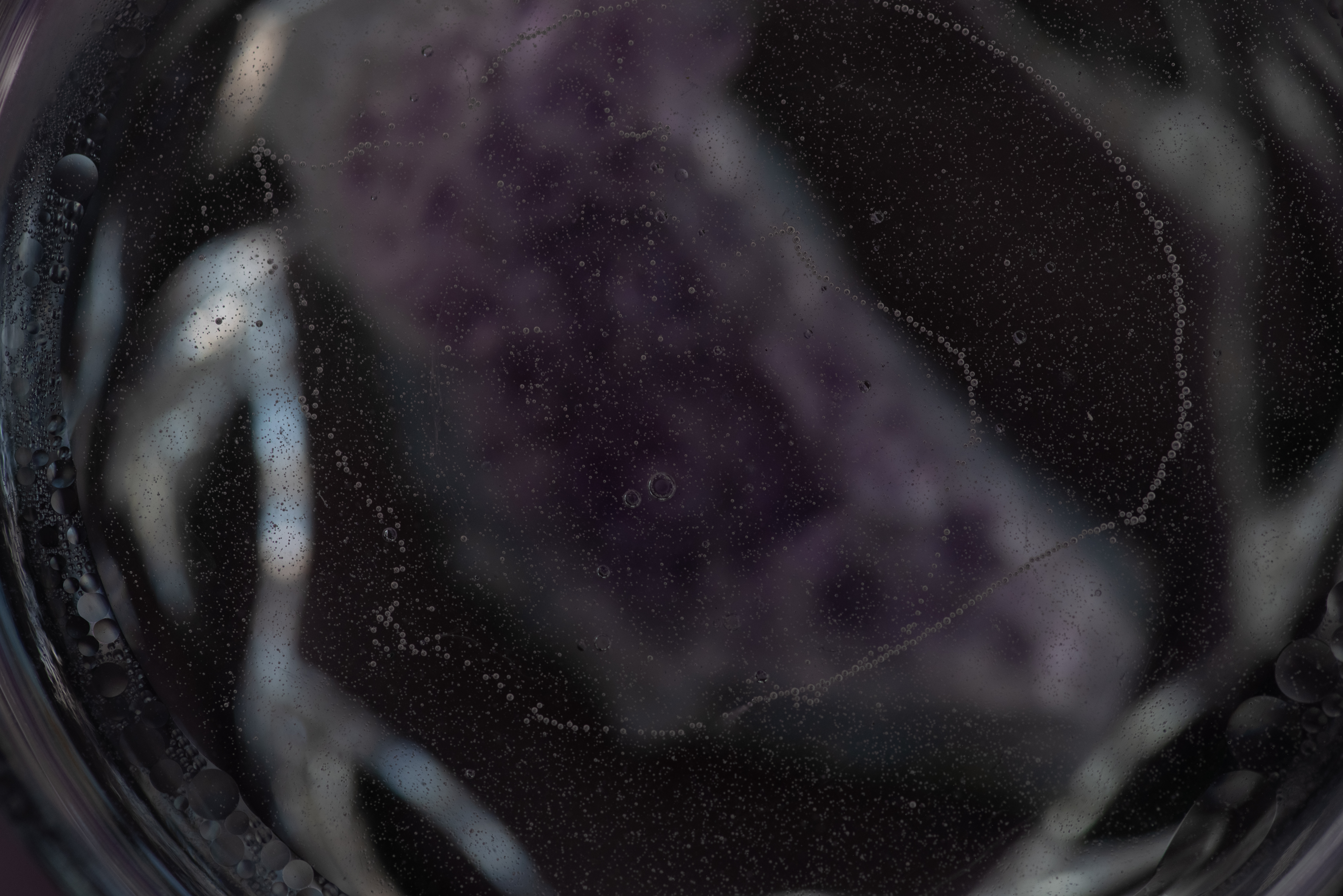 Violet did not start well. It’s the last picture I shot (before the “bonus” picture), and I felt I was getting at the end of what I could achieve on my theme. And…. it turns out that it’s my favorite for this round. I started by searching ideas for violet things on Google, and saw “amethyst” very early on. And hey, amethyst is significantly overrepresented in my tiny rock collection! So I started playing with my amethyst in various containers, moving water back and forth and being generally tired. I remember snapping this one because the lines of bubbles was uncommon – I still have no idea how that one happened, I thought there was a hair, but there wasn’t. I think that at that time there was mostly water, and the oil was mostly leftovers from surfaces and not really added per se. When I came back to my computer, I was very happy with what I was seeing – and particularly the fact that it was indeed sharp enough to use. I love how this looks like a starry night and/or a nebula, and I’m incredibly happy with this picture. The original image gives a better idea of the amethyst at the bottom!