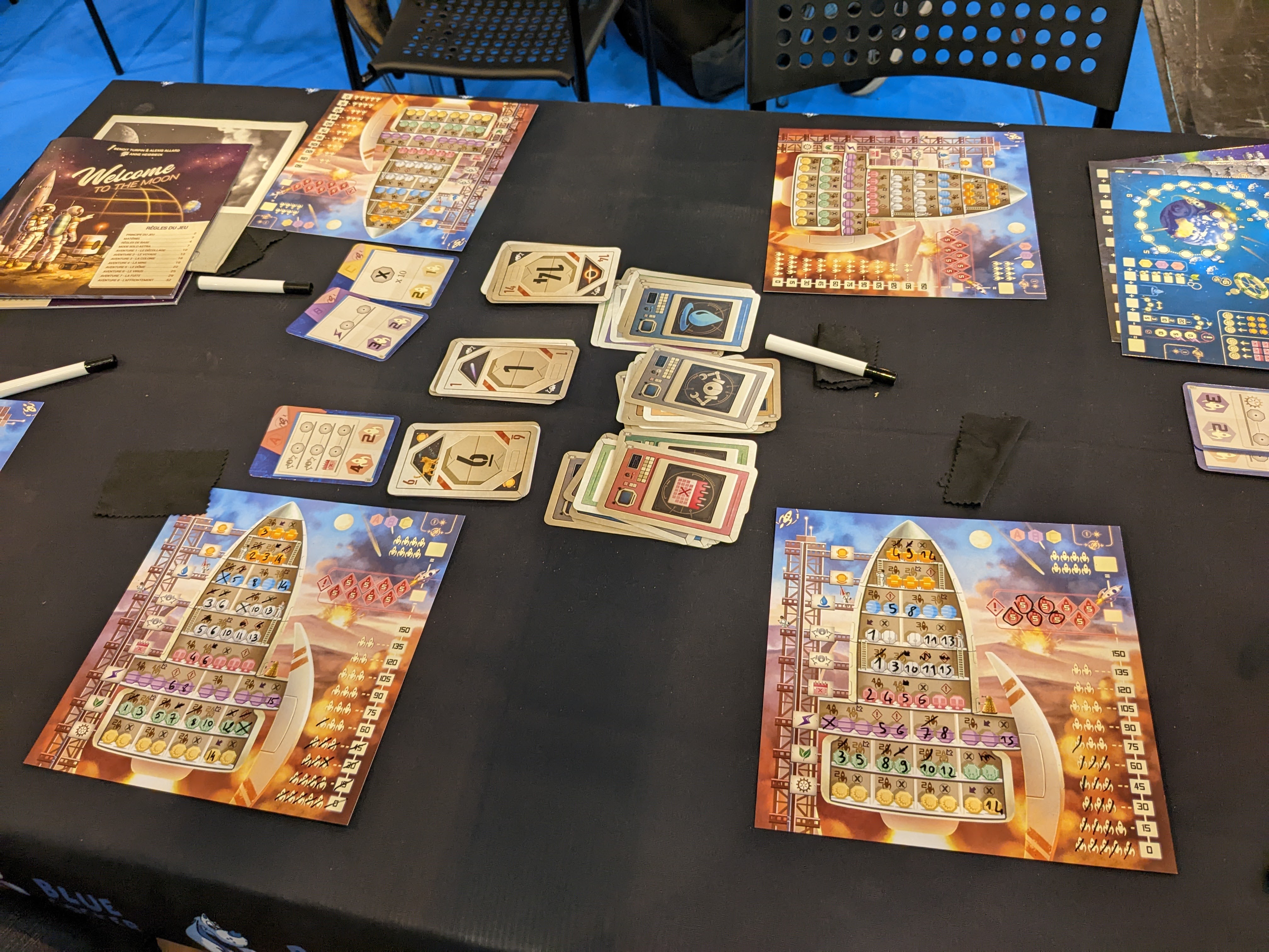 Now we’re back home… time for a few quick notes of all the games we saw! In order of play, because that’s approximately as arbitrary as I could make it anyway. I’ve been too lazy to add publishers/authors – but I’ve provided BGG links on the titles where available. Also, credit where credit’s due: many of these pictures are my husband’s 🙂 I kept these notes very short because it’s already a very long post; but I’m happy to give more details if you have specific questions!
