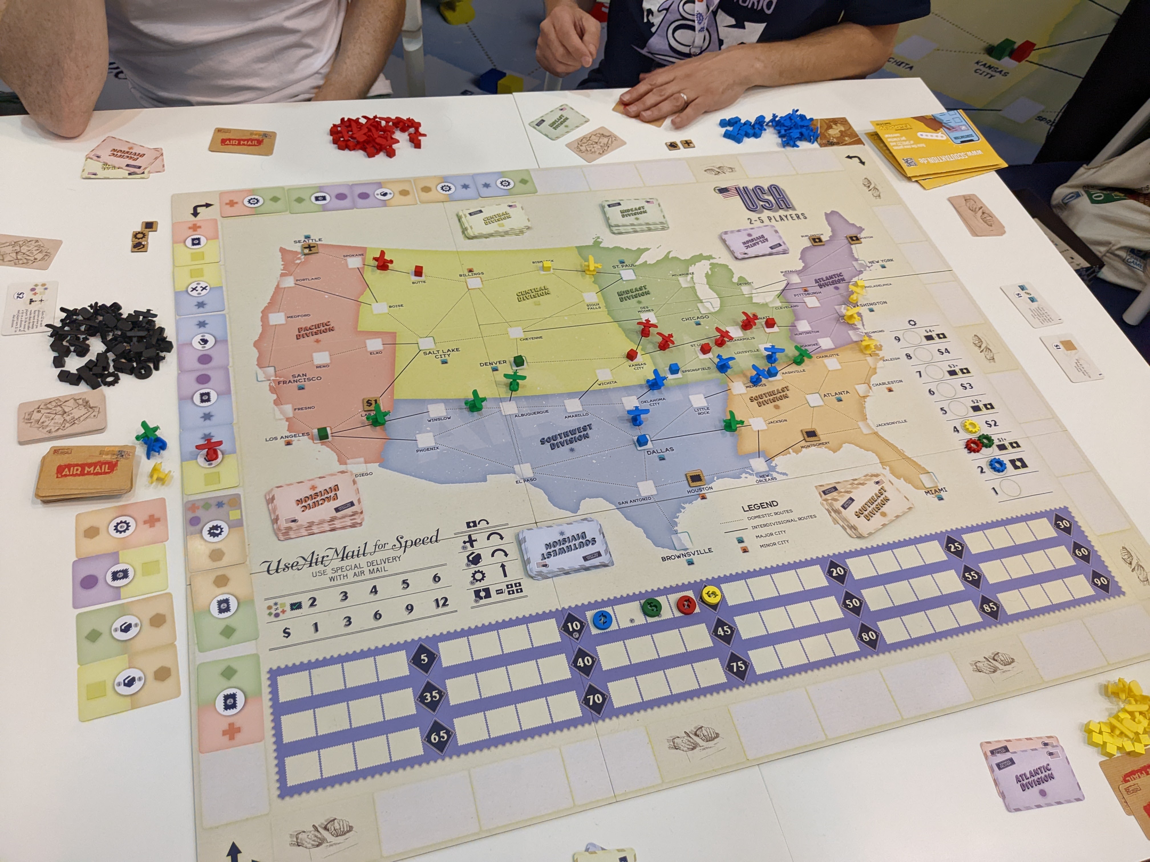A game where you develop air mail networks and use them to deliver packages. There’s interesting “colored domino” mechanics that constrain the places where you can execute actions, and it felt overall pretty solid, despite maybe benefiting from a house rule or two.