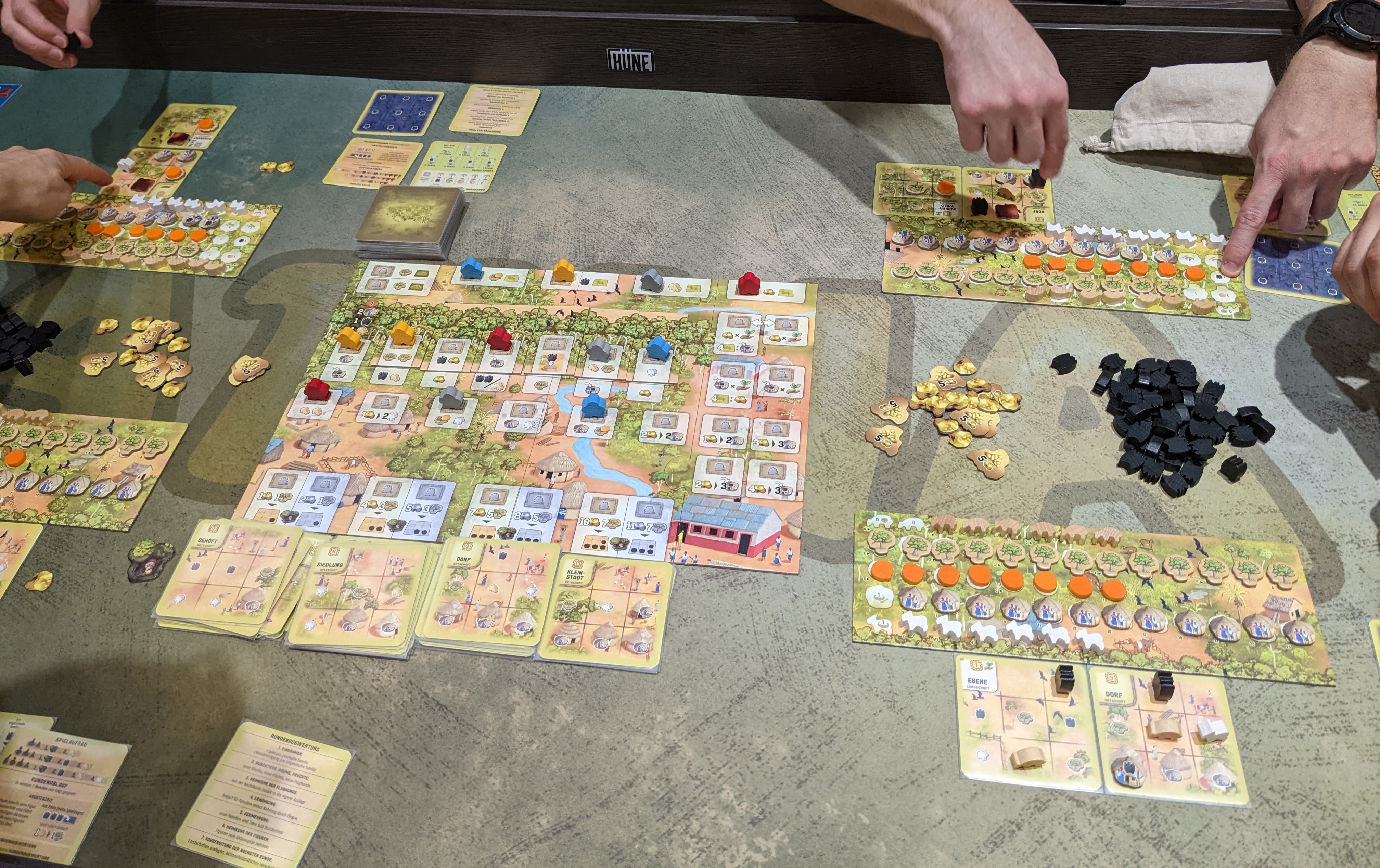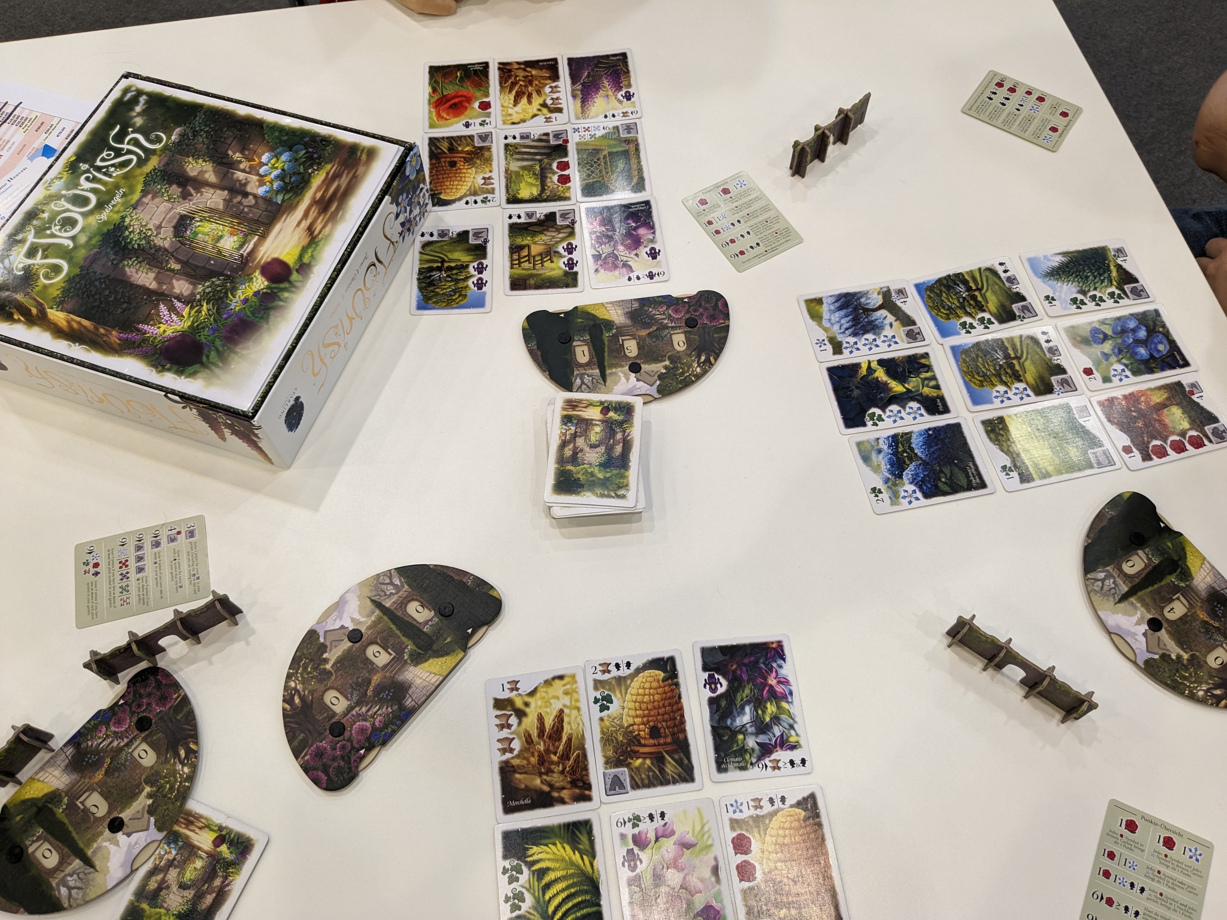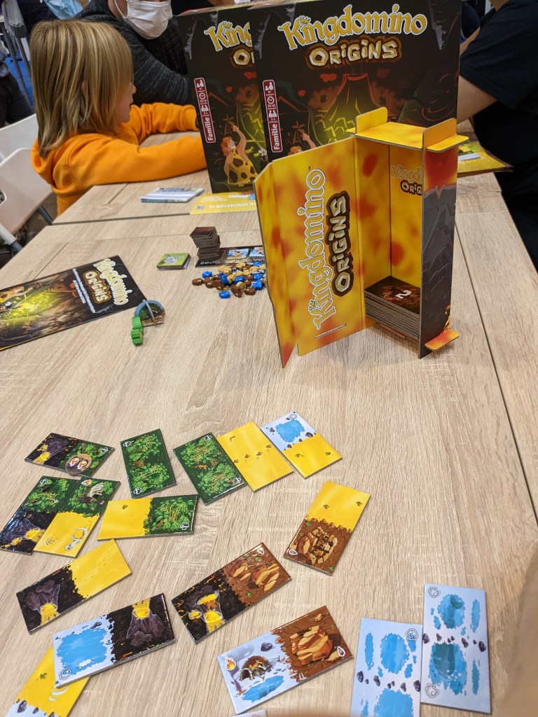 And, for the last game of this SPIEL, we found a table of Kingdomino Origins. It’s a variant of Kingdomino (which we know and love) with a few modes in the box. The basic mode is mandatory: you have volcanoes that throw fireballs on other tiles, and those replace the crowns in the original version – I like that, it gives me the impression of having a bit more control. The other modes introduce resources and people, and that was also a neat addition – with the drawback that it makes it more fiddly than the original’s beautiful simplicity.