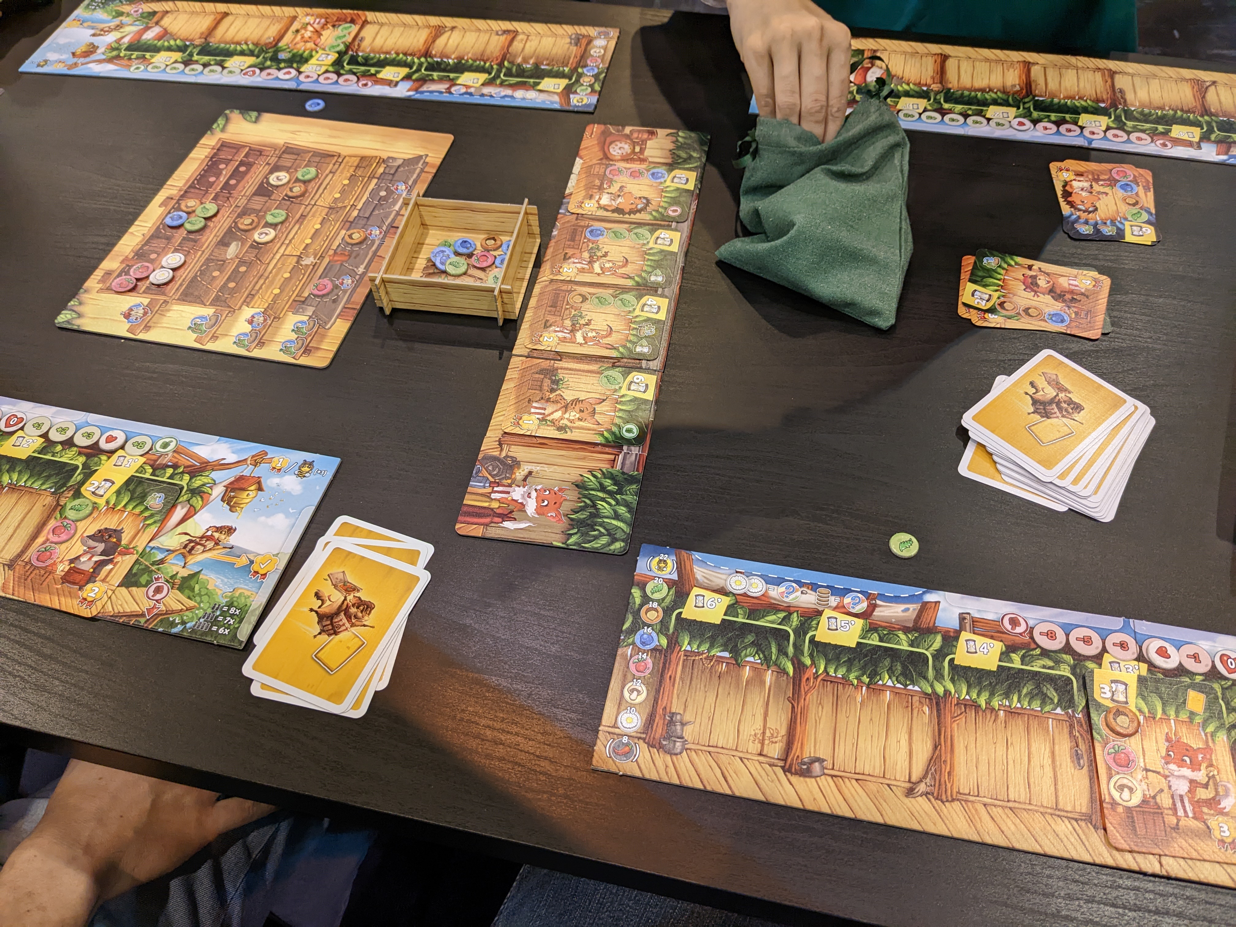 A 2-player tile-laying game where players score points depending on their majorities on areas they control at the end of three scorings. It was the end of the day, we might have appreciated/understood it better in different circumstances.