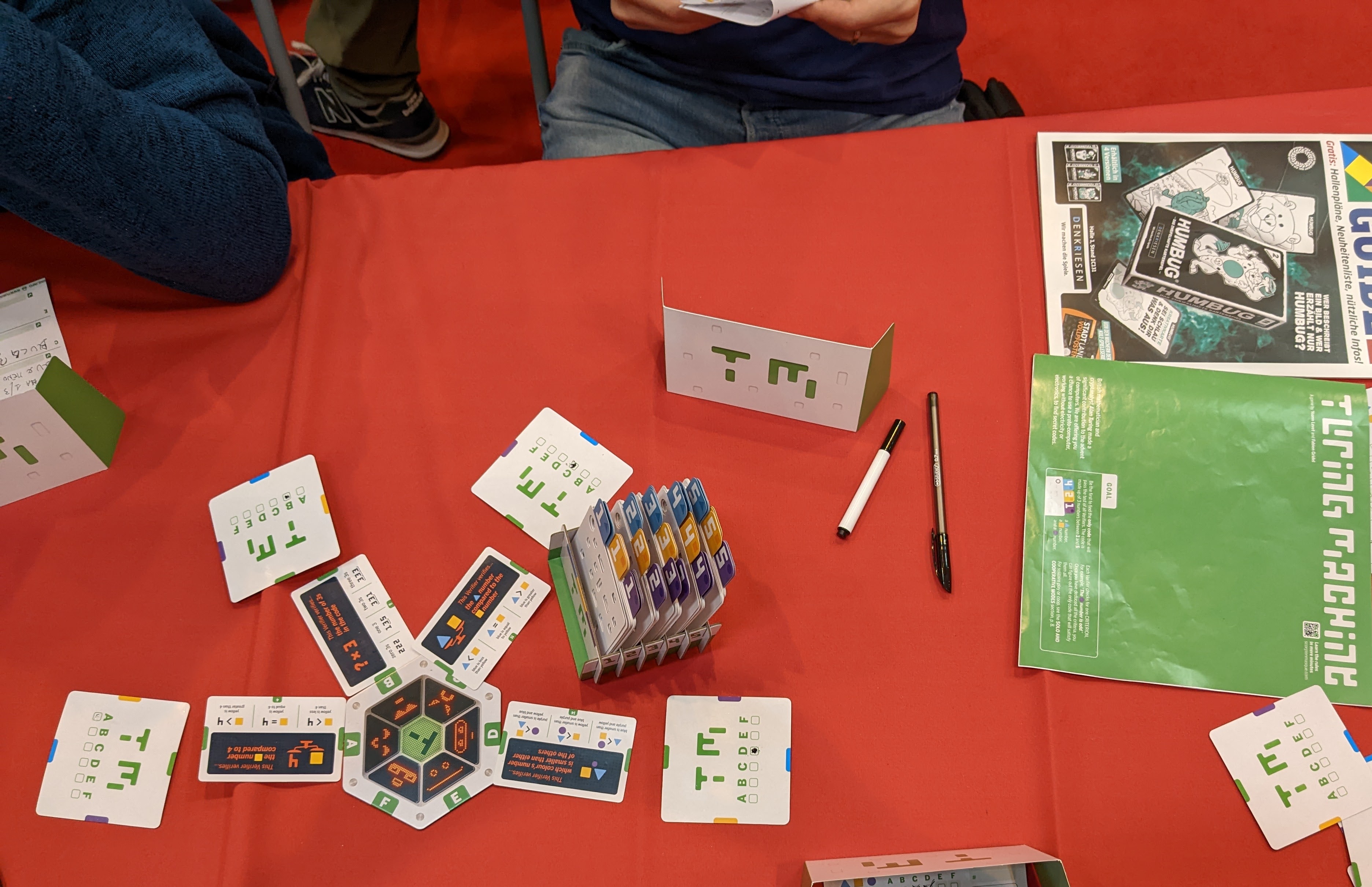 A tile-laying game using tri-hex tiles (like Taluva), with straightforward rules and scoring (different from Taluva). Also the game I lost the hardest during this SPIEL – but it was still fun, and we got a copy.