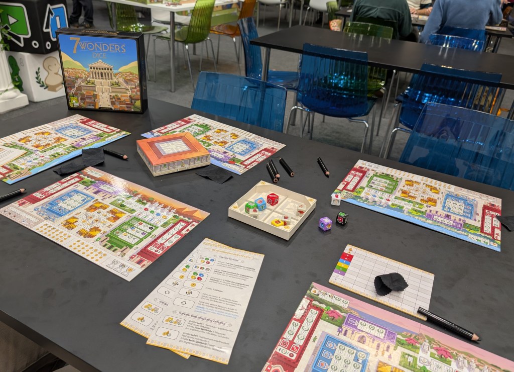 In the 7 Wonders Extended Universe, we know have: the dice game! This is a roll and write – at every round, a set of dice is rolled, of which each player chooses one (at the same time) and adds it to their player board for various effects. We could only play for a few numbers of rounds since it was the very end of the day, but again the overall feeling wasn’t enthusiastic.