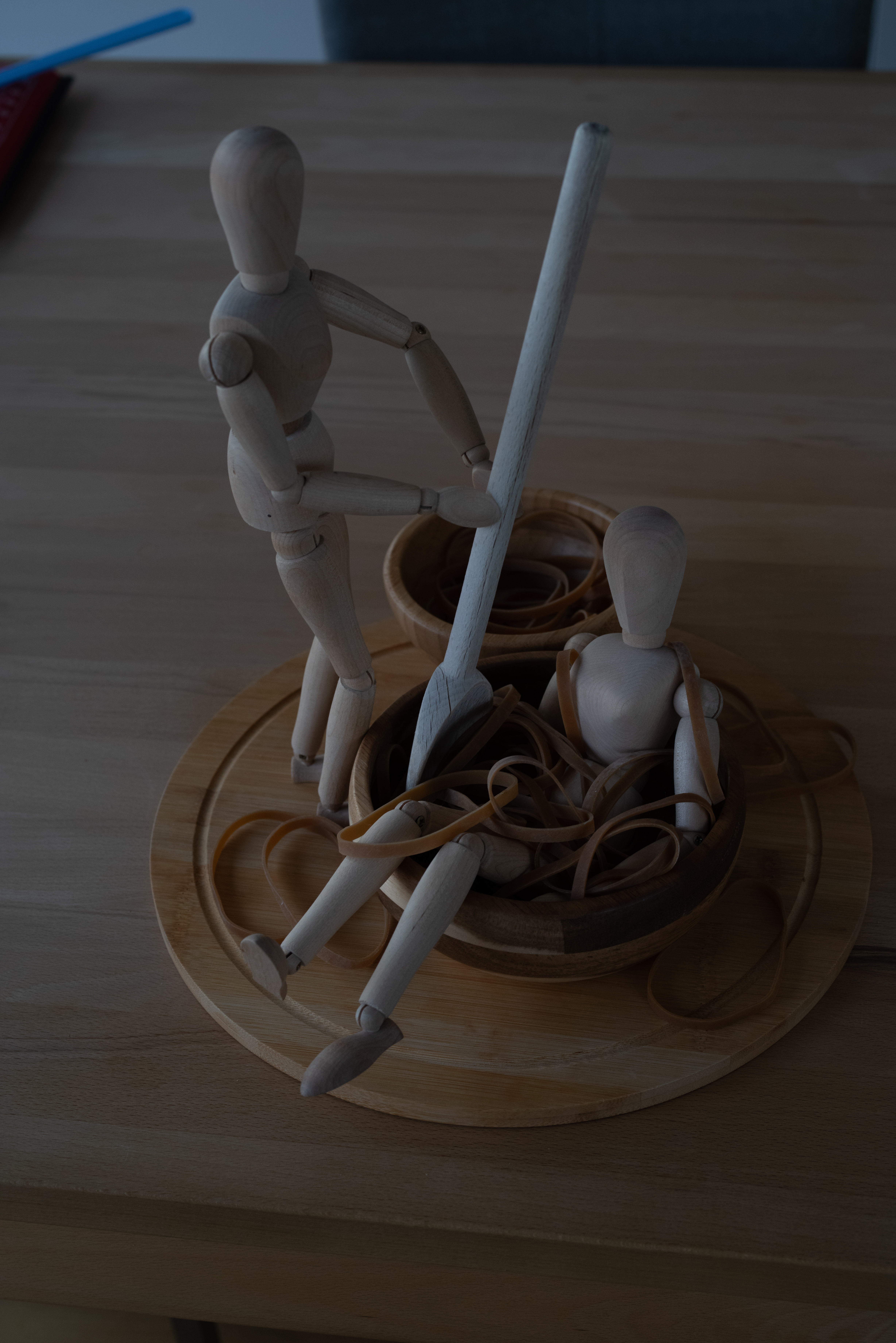 One of the words was “Monochrome”, with a specific “not black&white” constraint. Since I had a manikin theme, and my manikins are wooden, well, that gives me the palette for what I’m doing. So I started gathering everything that was vaguely wooden-colored in the apartment, and tried to assemble SOMETHING. My train of thoughts when building this image was “a manikin spa” – spas do have weird treatments going on, so why not an elastic-band based one for wooden manikins! I wanted to give the impression of relaxation for the one sitting, and of attending the other for the one standing. I’ve been told it could also look like the day after a student party – and I’m not disagreeing with that 🙂