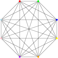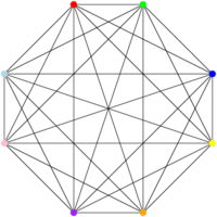The CLIQUE problem is described as follows: given a graph (a set of vertices and edges) , does it contain a clique of size ? A clique of size is a set of vertices that are all connected to one another. For instance, this thing below is a clique of size 8. Also note that it does contain cliques of size 1 (single vertex), 2 (an edge), 3 (a triangle), 4, 5, 6, 7, since we can find sets of vertices of that size that are all connected to one another.