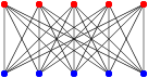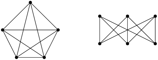 In these three drawings, two of them are plane: the graph is drawn such that edges of the graph do not cross. The first drawing is not plane: the edges 1-3 and 2-4 are crossing. A graph that can be drawn in the plane (that is to say, on a flat piece of paper) such that no two edges cross is called a planar graph. The fact that we have an adjective for such a graph should tell you that there exists non-planar graphs: graphs that cannot be drawn in the plane without crossing two edges. Two typical (and useful) examples are the complete graph on 5 vertices (5 vertices, and all possible edges) – denoted , and the complete bipartite graph on 3×2 vertices (2 groups and of three vertices, and all possible edges between vertices of group and vertices of group ), denoted . Here are their “usual” drawings; as we saw in the previous figure, these drawings are not unique. But you can search for a long long time for a drawing where no two edges cross (and not find it).