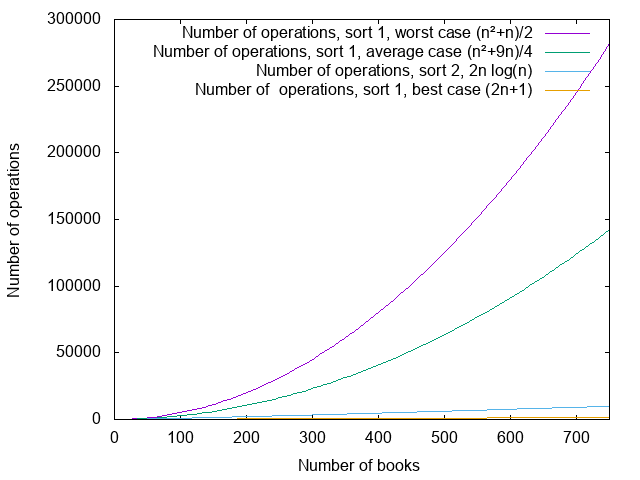 The first question is what happens to smaller elements of the formulas. The idea is that only keep what “matters” when looking at how the number of operations increases with the number of elements to sort. For example, if I want to sort 750 books, with the “average” case of the first algorithm, I have . For 750 books, the two parts of the sum yield, respectively, 140625 and… 1687. If I want to sort 1000 books, I get 250000 and 2250. The first part of the sum is much larger, and it grows much quicker. If I need to know how much time I need, and I don’t need that much precision, I can pick and discard – already for 1000 books, it contributes less than 1% of the total number of operations.