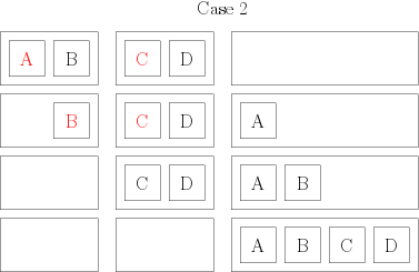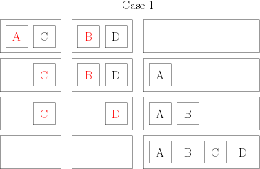 Then, I take my groups of two books, and I combine them again so that I have groups of 4 books, still in order. To do that, I compare the first two books of the group; the smaller of both becomes the first book of my group of 4. Then, I compare the remaining book of the group of 2 from which I picked the first book, and I put the smaller one in position 2 of my group of 4. There, I have two possibilities. Either I have one book in each of my initial groups of 2: in that case, I compare them, and I put them in order in my group of 4. or I still have a full group of two: so I just have to add them at the end of my new group, and I have an ordered group of 4. Here are two little drawings to distinguish both cases: each square represents a book whose author starts by the indicated letter; each rectangle represents my groups of books (the initial groups of two and the final group of 4), and the red elements are the ones that are compared at each step.