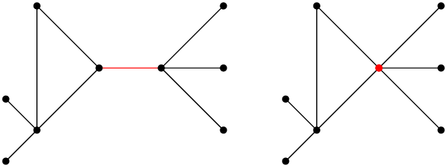 Removing an edge is easy: if two vertices are connected by an edge, we can decide that in fact they aren’t, and remove the edge. Removing a vertex is also easy: pick a vertex, remove it, and remove all the edges that are connected to it, because otherwise we don’t know where they’re going anyway. Contracting a vertex is a tiny bit more complicated: the idea is that we pick two vertices that are connected with an edge, and we “merge” them in a single vertex. The resulting vertex is connected to all the edges of the initial two vertices that were in the original graph. One can imagine “pinching” the two vertices that get closer and closer until BOOM they fuse together. For a small example, in which I contract the vertices connected by the red edge in a single vertex: