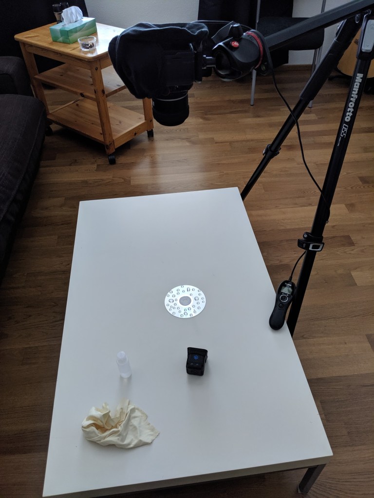 So: CD, white table, room that can be darkened, tripod with a tilting center column (<3 Manfrotto), a way to make water drops and to remove dust, and a LumeCube. Also to be noted: there is a SOCK on top of my camera, because the very white PENTAX logo was reflecting in the CD on my first attempts (which sucked). The idea for the rainbow CD picture is to have a fairly long exposition (I had 20 seconds there), and to move around the CD with a light to create the rainbow effect. It took me A LOT of experimentation and A LOT of shots to get the one I finally decided for. And then it took me A LOT of time to get a clean image. It turns out that CDs tend to be slightly scratchy, slightly dusty, and even if you don’t see it on naked eye, that’s ALL YOU CAN SEE when you have an enlarged picture of them on your screen. So I spent a lot of time in Darktable to clean up the image.