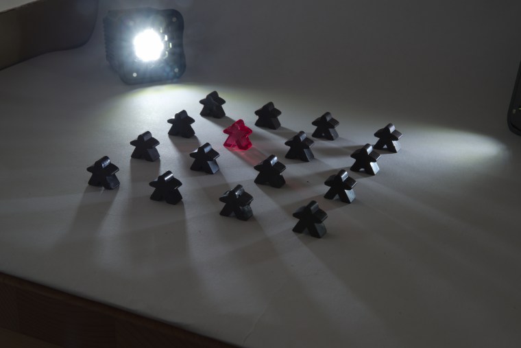 The idea came by chance – Pierre made some chocolate meeples to start experimenting with making his own chocolate molds (with ComposiMold), and he had put a red plastic one in the bowl as a joke. I played with a lot different configurations and structures before settling on this – which I took quite some time setting up in my lightbox with a ruler and everything! And then I spent quite some time experimenting with the lights and the different angles and so on, until I ended up with this in camera (that’s the RAW exported in Darktable as JPG without any extra processing):